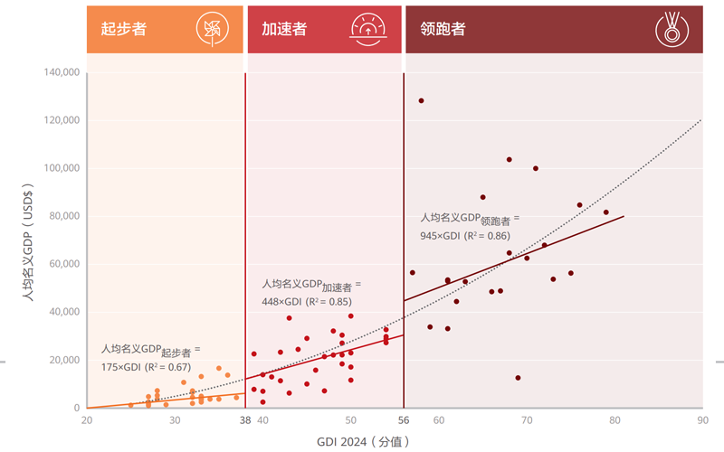 GDI 分(fen)(fen)(fen)析了 ICT 產業(ye)發(fa)展成熟度與(yu)實(shi)現(xian)數字經(jing)濟增(zeng)(zeng)長的(de)(de)(de)(de)(de)關聯性。通過(guo) GDI 與(yu) GDP 的(de)(de)(de)(de)(de)相(xiang)關性分(fen)(fen)(fen)析表明, GDI分(fen)(fen)(fen)值(zhi)越高的(de)(de)(de)(de)(de)國家,ICT發(fa)展所帶來的(de)(de)(de)(de)(de)經(jing)濟效(xiao)益更(geng)大。研究還進(jin)一步將三類國家的(de)(de)(de)(de)(de)GDI分(fen)(fen)(fen)值(zhi)變化與(yu)GDP增(zeng)(zeng)長關系,進(jin)行了具體分(fen)(fen)(fen)析,并(bing)發(fa)現(xian) :領跑者 GDI 分(fen)(fen)(fen)值(zhi)每提升(sheng) 1 分(fen)(fen)(fen),潛在提升(sheng)人(ren)均 GDP 945 美金,是(shi)(shi)加速者國家的(de)(de)(de)(de)(de) 2.1 倍(bei),是(shi)(shi)起步者國家的(de)(de)(de)(de)(de) 5.4 倍(bei)。