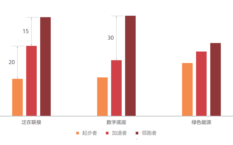 為(wei)了尋找解決數字(zi)鴻(hong)溝的有效(xiao)路徑,GDI分(fen)(fen)(fen)析(xi)了三類國(guo)家在(zai)技術使能要素(su)上的表現(如(ru)圖(tu)),泛(fan)(fan)在(zai)聯接是造 成三類國(guo)家差距的主要矛盾。從泛(fan)(fan)在(zai)聯接的分(fen)(fen)(fen)值來看(kan),領(ling)跑者比加(jia)(jia)速者、起步者分(fen)(fen)(fen)別領(ling)先15分(fen)(fen)(fen)和(he)35分(fen)(fen)(fen)之多;同時,領(ling)跑者與加(jia)(jia)速者在(zai)數字(zi)底(di)座的分(fen)(fen)(fen)差也達30分(fen)(fen)(fen)之多,而加(jia)(jia)速者與起步者在(zai)數字(zi)底(di)座上差異較(jiao)小。