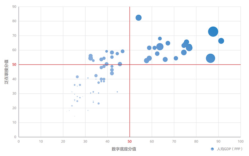 對于領(ling)跑者而言,泛在聯(lian)接(jie)(jie)與數(shu)字(zi)底(di)座均得分較(jiao)高。研究表(biao)明,當泛在聯(lian)接(jie)(jie)與數(shu)字(zi)底(di)座均超(chao)過50分時,能夠更好地相互(hu)促進(jin),對數(shu)字(zi)經濟發展產生乘數(shu)效應。對于僅在泛在聯(lian)接(jie)(jie)表(biao)現較(jiao)高的(de)國家,因為數(shu)字(zi)底(di)座的(de) 投(tou)資不足(zu),缺乏(fa)處(chu)理(li)大量數(shu)據和數(shu)字(zi)應用(yong)所需的(de)算力(li)和存力(li),導致(zhi)無法進(jin)一步(bu)有效提(ti)升生產力(li)和創新水平。