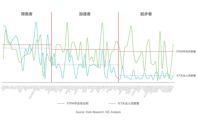 STEM學生(sheng)是ICT人(ren)才的(de)主要來源,研究發現,三類國(guo)家都重視對于ICT人(ren)才的(de)培養,STEM畢(bi)(bi)業(ye)的(de)比例均(jun)接近25%。但(dan)由于各國(guo)ICT產(chan)業(ye)發展不(bu)均(jun),ICT就業(ye)崗(gang)位供給存在差異,導致ICT從業(ye)人(ren)員的(de)轉化率差異較大。95%的(de)STEM畢(bi)(bi)業(ye)生(sheng)在領跑(pao)者(zhe)國(guo)家能順(shun)利從事ICT相關領域的(de)工(gong)作(zuo),加速者(zhe)國(guo)家有50%的(de)STEM畢(bi)(bi)業(ye)生(sheng)能夠找(zhao)到ICT相關就業(ye)機會,而(er)起(qi)步者(zhe)國(guo)家這個比例僅有15%。